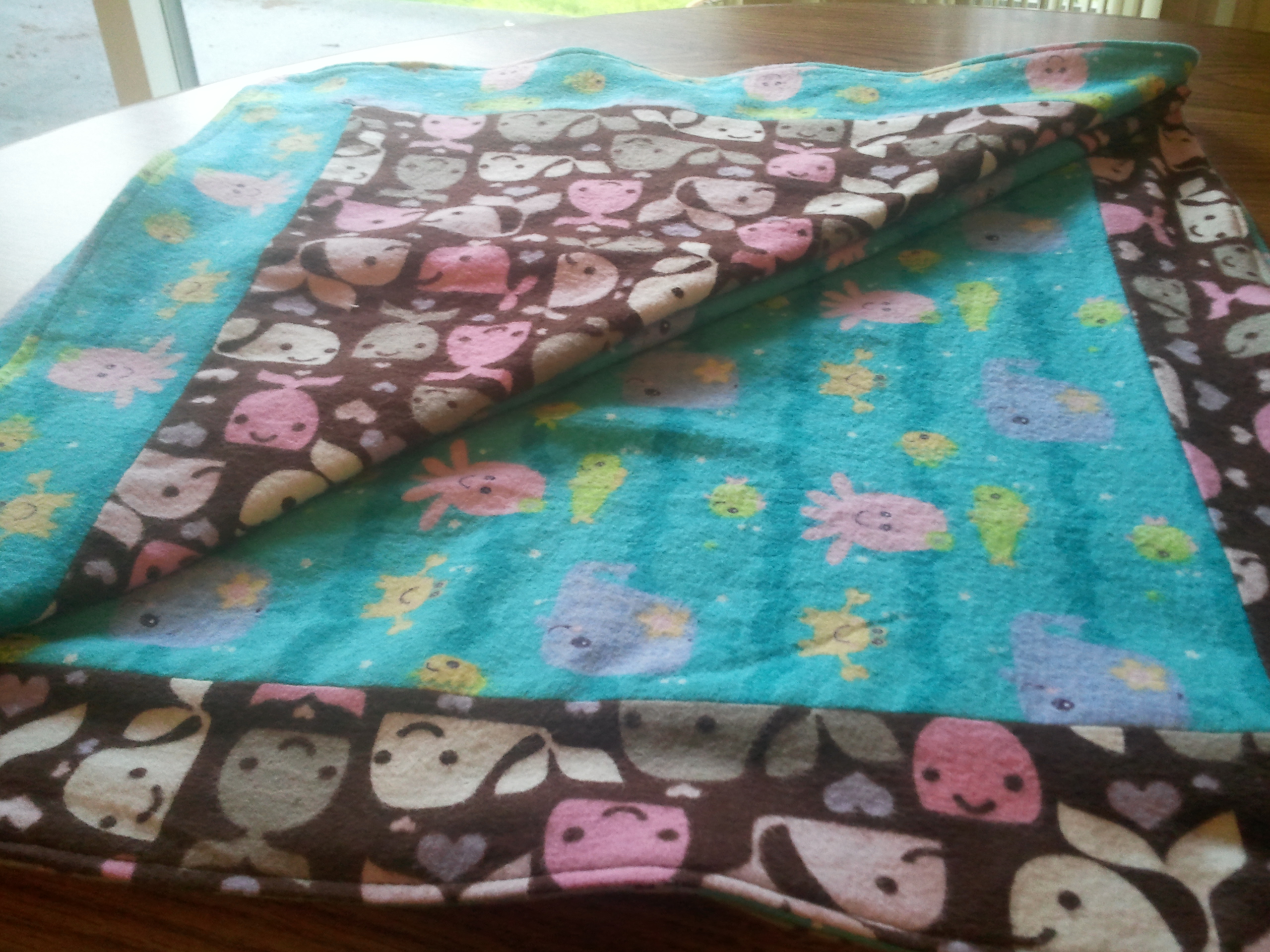 The blanket turned out better than I imagined. It was so adorable that I had a hard time giving it to my friend to give to her friend. It took a lot of labor to carefully measure and cut the pieces, but the sewing went quickly–a lot faster than a crocheted blanket. I will definitely keep this in mind for the next friend who is having a baby.