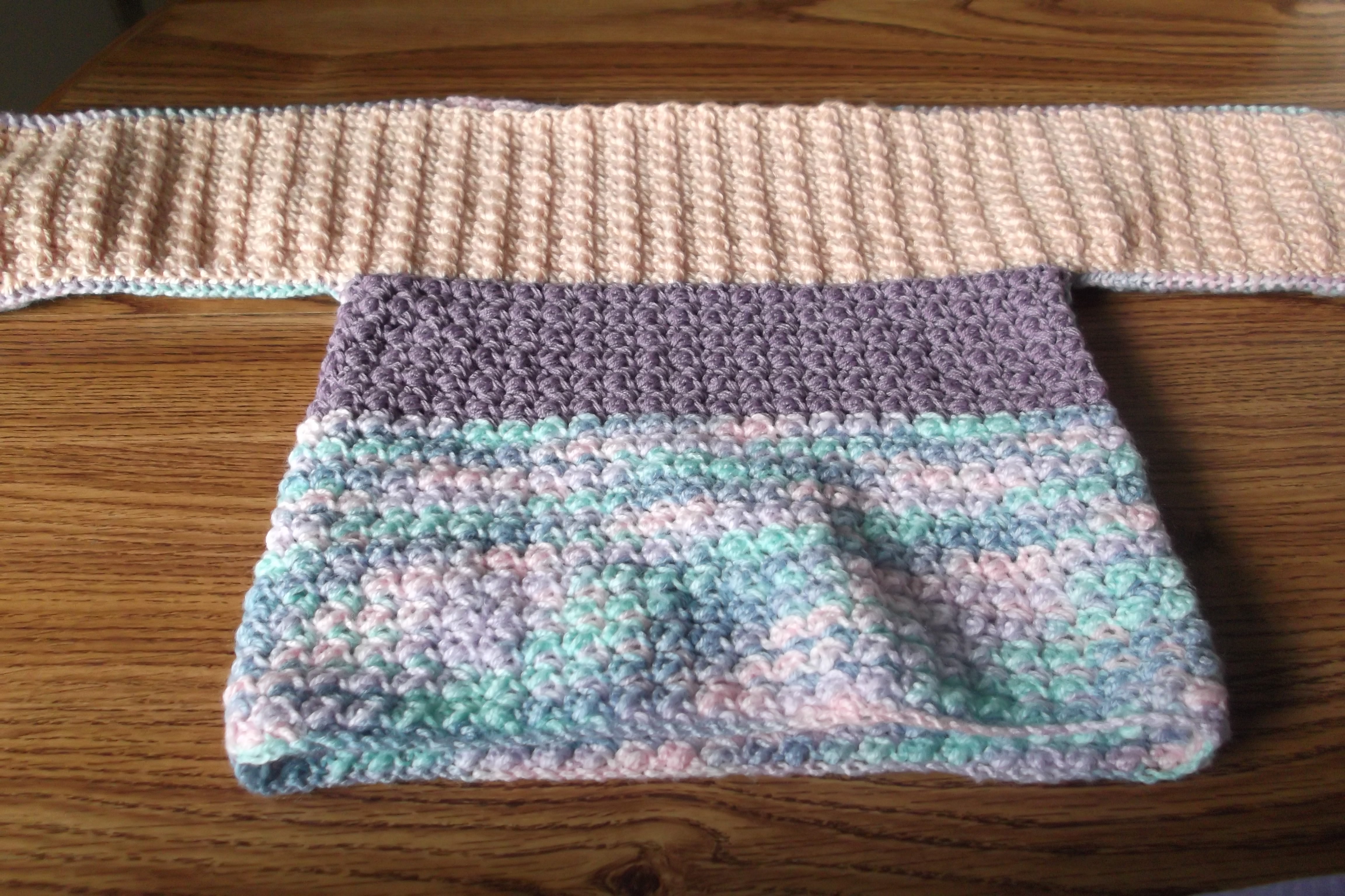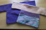 My friends worked on blankets and I worked on the only crochet pattern on the site, a sweater. It is a very boxy sweater, but it was so much fun to make. I started with variegated yarn and made one side of the sweater, then started on the second side of the sweater and ran out. I switched to another yarn and ran out of that as well — that’s the trouble with using scrap yarn on a project. But I actually really like the finished product, with the different bands of colors. I ended up making a second sweater in solid purple.
