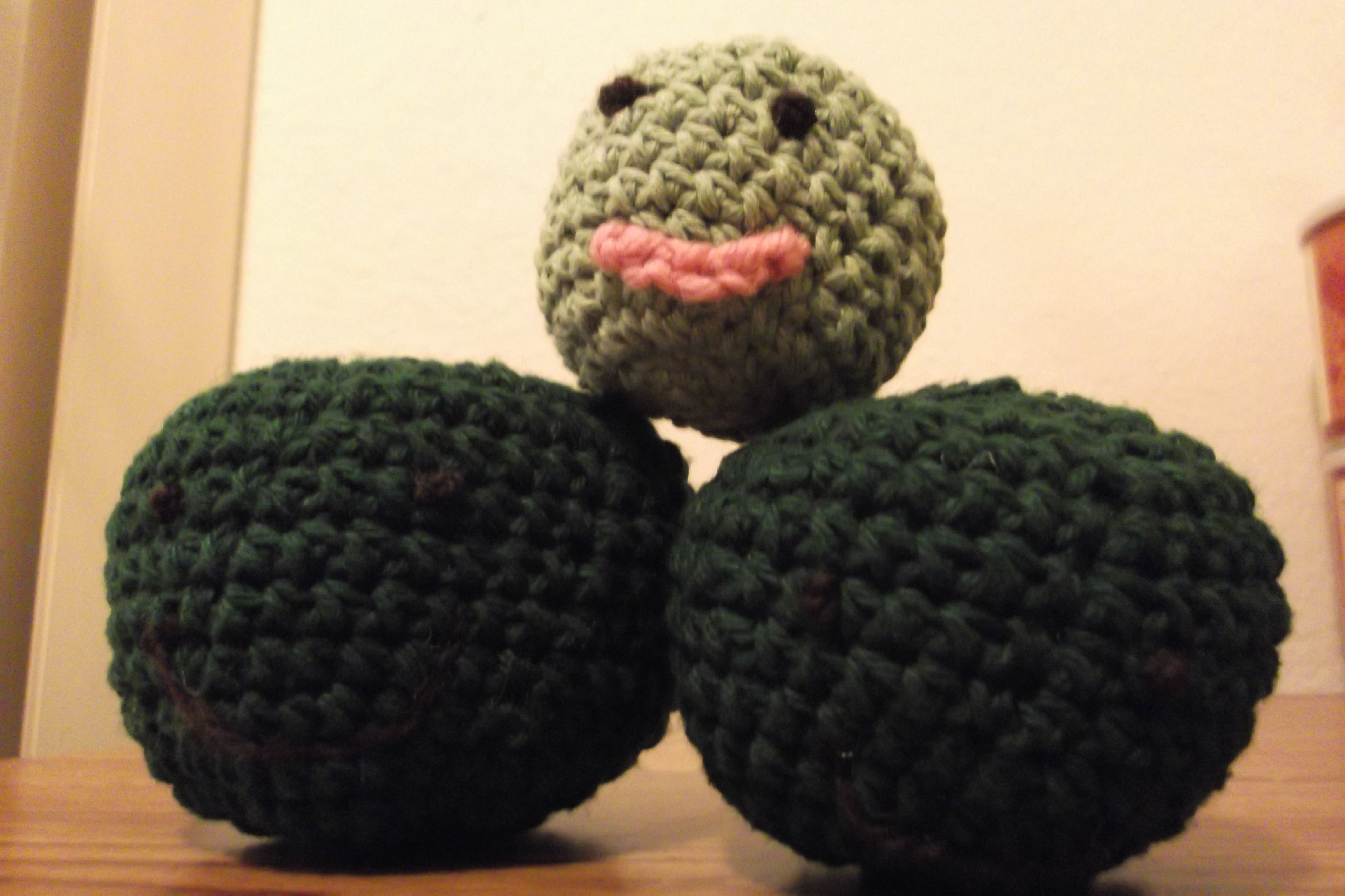 I decide to adapt the apple pattern (free but requires registration) to make G a set of peas. The darker, larger peas are Mama and Papa Pea, and obviously, the lighter, smaller one is Little Pea himself. G and I used to work together, and tossing these peas around became a great stress reliever around the office.